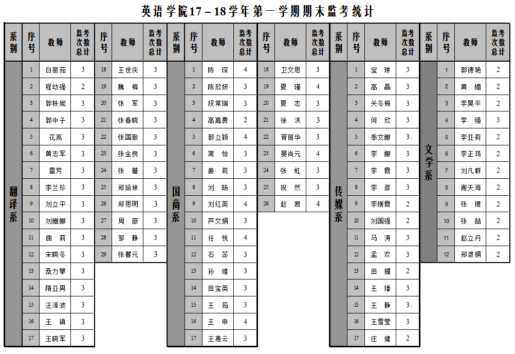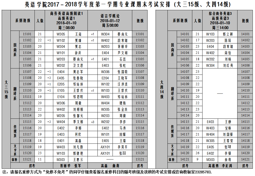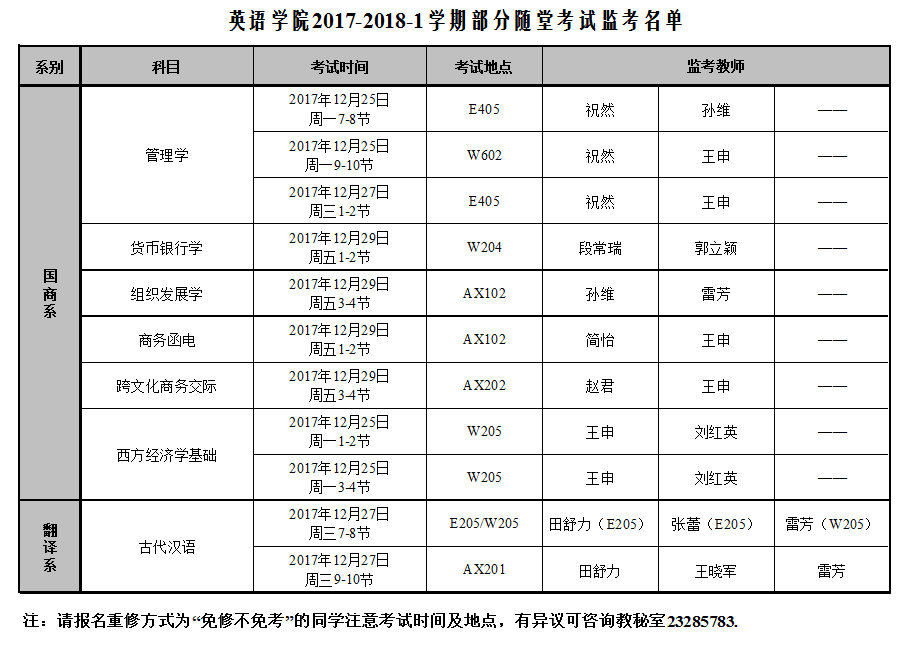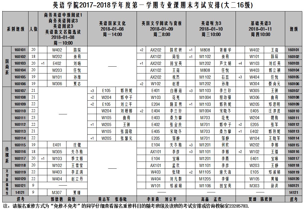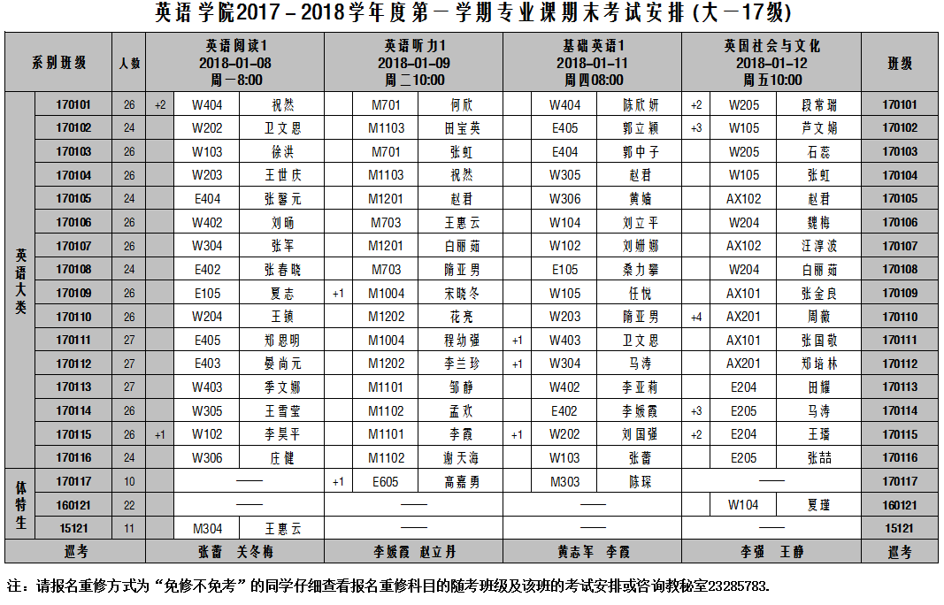 英语学院2017-2018-1学期专业课期末考试安排