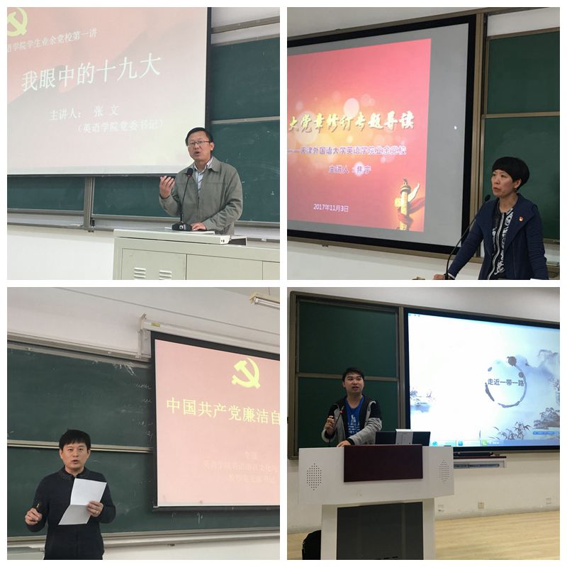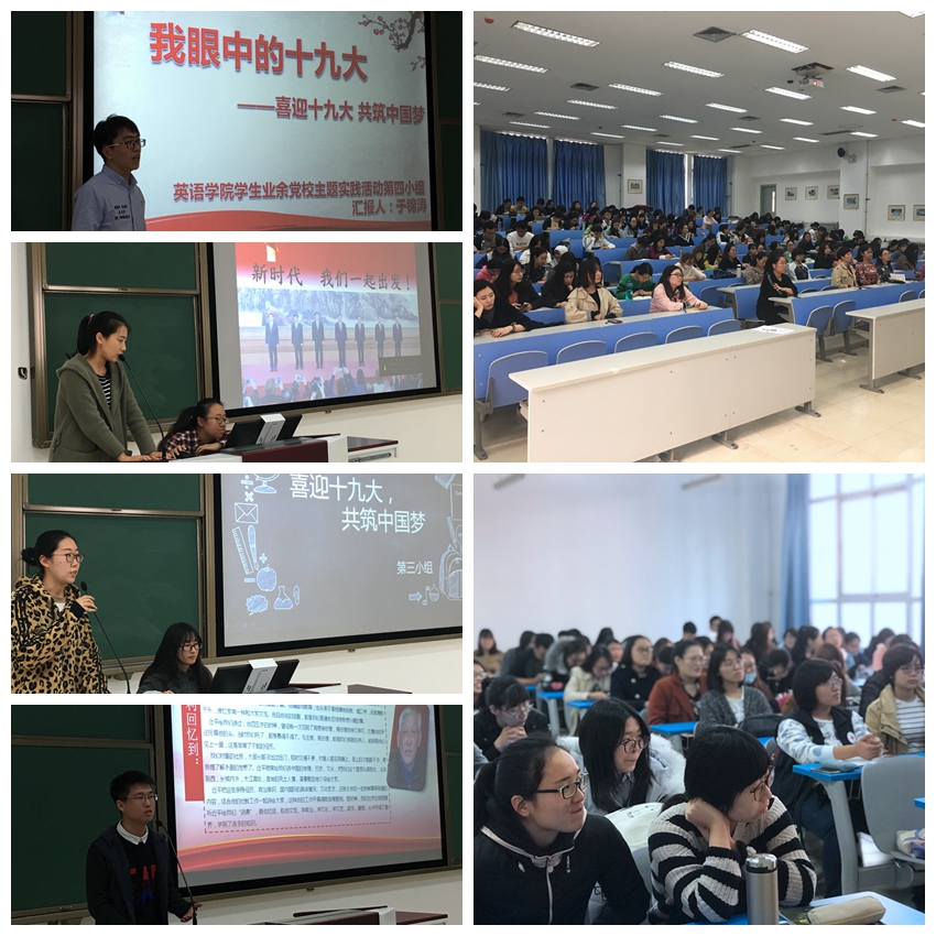 10月26日中午,英语学院学生业余党校在逸夫楼AX201举行开班仪式,学院党委书记张文、副书记焦宁及团委辅导员老师共同出席。会上,张文书记从“关注”、“发展”、“教育”三个层面具体展开,为全体学员做了“我眼中的十九大”专题讲座,引导学员认真学习十九大精神,提高个人的政治学习能力。学院党委副书记焦宁举办专题讲座,为全体学员逐条详细解读《党章》的修订,引导学员关注新变化。学院还邀请教工党支部书记代表李强、学生党支部书记代表周子杰分别进行《中共共产党廉洁自律准则》、“一带一路”相关内容的介绍。此外,党校安排党的纪律与组织发展程序、党员的义务和权利、《中国共产党党员权利保障条例》、《习近平的七年知青岁月》等专题解读。在讨论环节中,学员们对“做新时代青年”、“坚定理想信念”等话题展开讨论。党史知识竞赛引导党校学员回顾党的发展历程,重温老一辈革命家的丰功伟绩;主题实践活动中,各小组结合自身学习、生活,以身边事为切入点,团结协作,积极配合,从多角度出发,从校内走向校外,学员参与热情高涨。