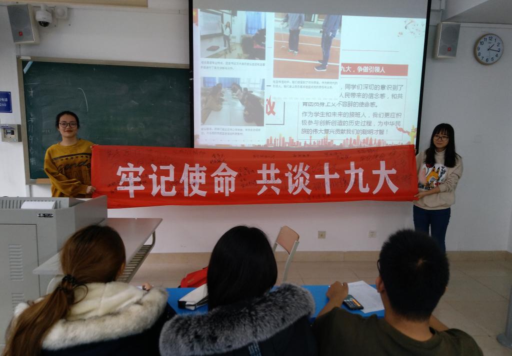十九大召开之后,英语学院各团支部陆续开展理论学习,一场场关于十九大的理论知识讲解如火如荼。160118团支部在逸夫楼教室组织团员学习总书记十九大报告,认真倾听了习总书记对于过去五年的总结以及未来五年的计划。大家对此都深有感触,任政同学“作为新一代知识青年,我们有责任有义务努力学习科学文化知识,为国家的发展增砖添瓦,为实现中华民族的伟大复兴做出贡献”的发言反响热烈;160112团支部组织了一场生动、有意义的知识竞赛,同学们在抢答环节争先恐后,积极讨论;“悦”读分享会上,同学们纷纷介绍了自己喜爱的书籍,如汪曾祺先生的《受戒》、川端康成的《雪国》以及《共产党宣言》等;160114团支部的主题团日活动分为“我们的十九大故事”“身边的十九大热词”“十九大知识竞赛”“看图猜事件,重温复兴之路”“让党常驻心中应该依靠理论还是实践的辩论赛”五个环节,支部团员参与热情高涨;160105团支部结合英语专业特色,搜集十九大热词“极不平凡的五年”、“新时代中国特色社会主义”等进行分享,在拓宽专业知识面的同时,引领青年关注时事聚焦十九大。