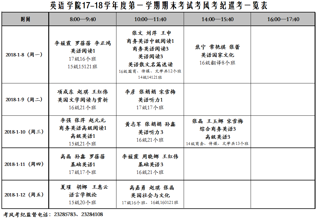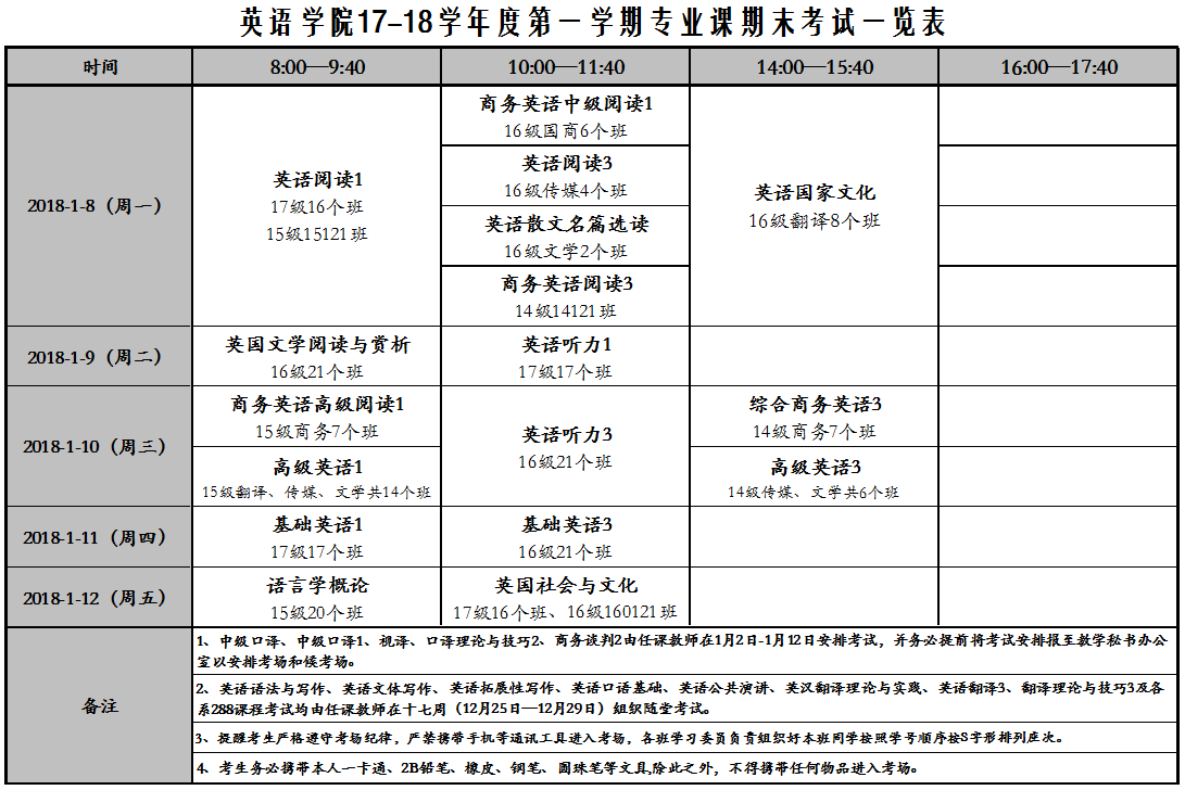 英语学院2017-2018-1学期专业课期末考试安排