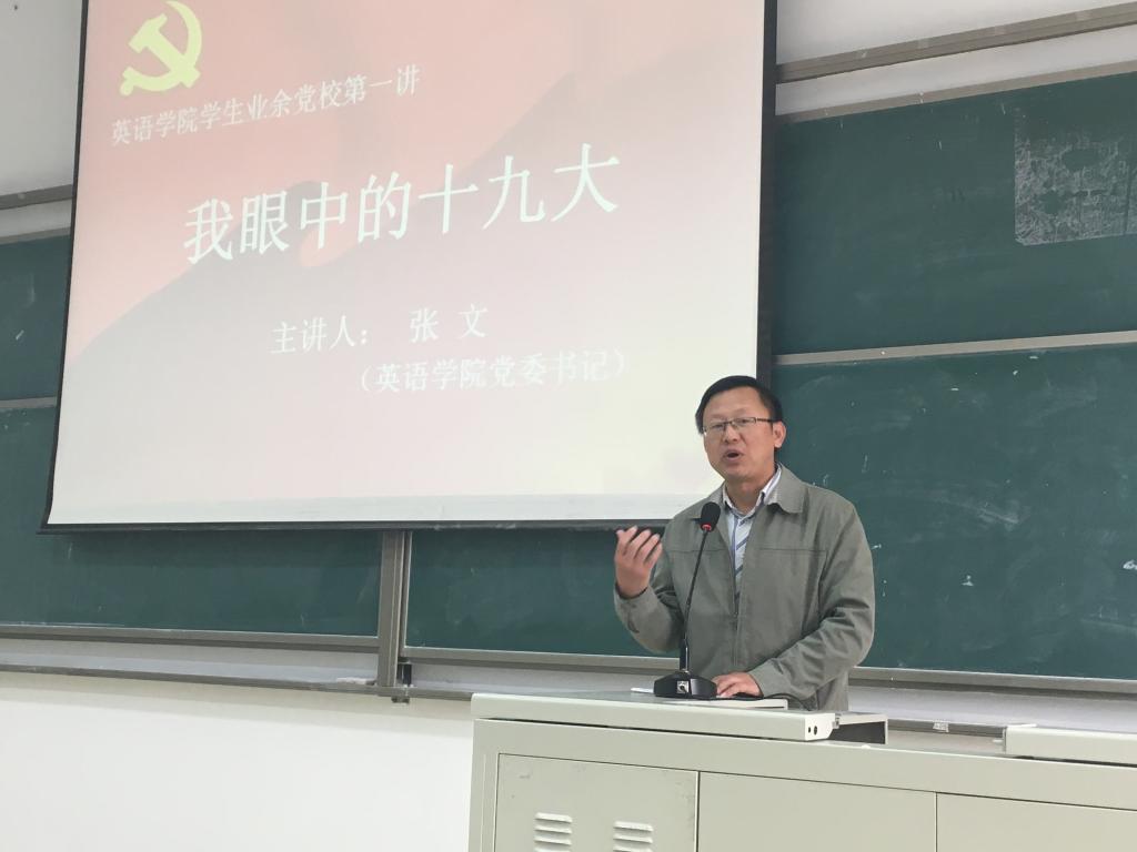 为庆祝中国共产党第十九次全国代表大会(以下简称“十九大”)胜利召开,加深发展对象、预备党员和正式党员对党章、党的理论知识及习近平总书记系列重要讲话精神的理解,10月26日中午,英语学院学生业余党校在逸夫楼AX201开班,学院党委书记张文、副书记焦宁及辅导员出席,张文书记为全体学员做了“我眼中的十九大”专题讲座。