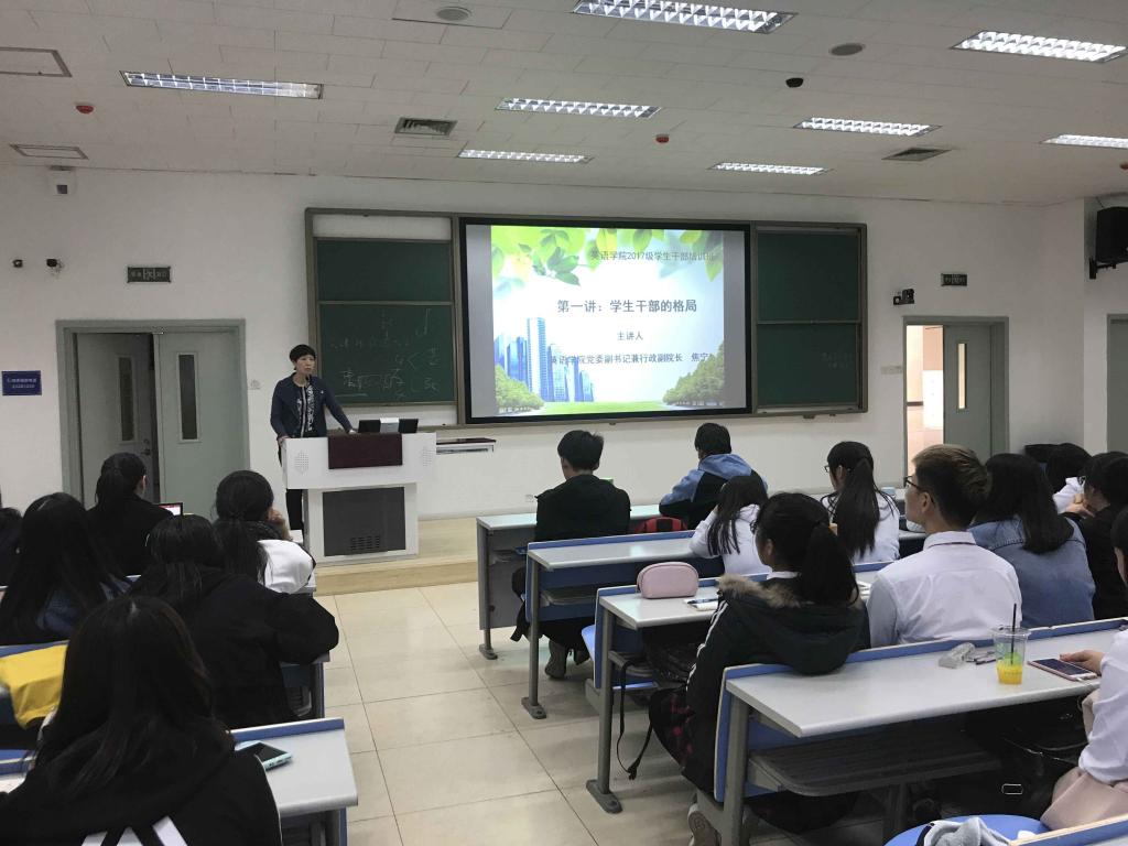 为做好学生干部的教育和培养工作,英语学院近日组织2017级近百名学生干部参加培训,11月2日英语学院党委副书记兼行政副院长焦宁为2017级学生干部培训班带来开班第一讲---学生干部的格局,这也拉开了本次培训的序幕。