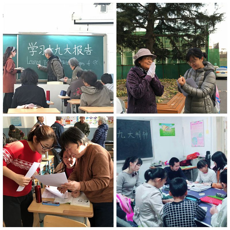 十九大召开之后,具有积极意义的正能量深入人心,各个团支部走出校园来到基层社区,开展社会实践和志愿服务。170109团支部来到人民公园,开展了一次整理与摆放共享单车活动,虽然只是很简单的一项工作,但同学们依旧因能为城市贡献出自己的绵薄之力而感到骄傲。170114团支部在天津市长虹生态园体验了“城市清洁工”的一天,他们收捡垃圾分类处理,简单的动作,却让大家深刻体会到环境与人类唇齿相依的意义;170106团支部的团日实践活动覆盖面较为广泛,分为三个小组:第一小组进入了下瓦房老年大学英文班,用英语为老人们讲解了与十九大有关的单词;第二组同学进入了宁夏路小学,用绘图、舞蹈等小学生喜爱的方式,生动形象地为学生们展示了十九大的魅力;第三组同学则是在校园内随机采访了学生与路人,请他们谈了谈自己心目中的中国以及对祖国未来的期待与憧憬,爱国气氛浓烈,令人拍手称赞;160104团支部来到下瓦房市民学校,分别进入三个学习班级,与爷爷奶奶们分享了十九大报告的学习体会。