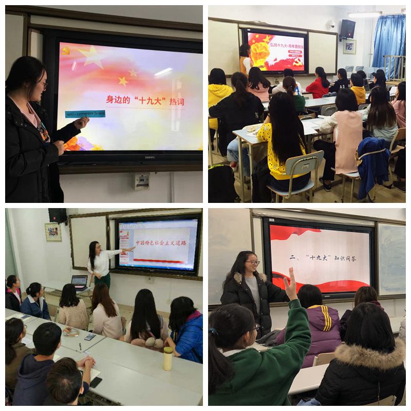 十九大召开之后,英语学院各团支部陆续开展理论学习,一场场关于十九大的理论知识讲解如火如荼。160118团支部在逸夫楼教室组织团员学习总书记十九大报告,认真倾听了习总书记对于过去五年的总结以及未来五年的计划。大家对此都深有感触,任政同学“作为新一代知识青年,我们有责任有义务努力学习科学文化知识,为国家的发展增砖添瓦,为实现中华民族的伟大复兴做出贡献”的发言反响热烈;160112团支部组织了一场生动、有意义的知识竞赛,同学们在抢答环节争先恐后,积极讨论;“悦”读分享会上,同学们纷纷介绍了自己喜爱的书籍,如汪曾祺先生的《受戒》、川端康成的《雪国》以及《共产党宣言》等;160114团支部的主题团日活动分为“我们的十九大故事”“身边的十九大热词”“十九大知识竞赛”“看图猜事件,重温复兴之路”“让党常驻心中应该依靠理论还是实践的辩论赛”五个环节,支部团员参与热情高涨;160105团支部结合英语专业特色,搜集十九大热词“极不平凡的五年”、“新时代中国特色社会主义”等进行分享,在拓宽专业知识面的同时,引领青年关注时事聚焦十九大。